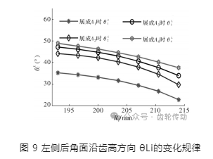 圖 9 是 θLi 隨環面半徑的變化情況繪制成曲線圖,通過分析可知,對于左側后角面,各個刀齒展成出的側后角面的形狀呈現上小下大的趨勢,同時,左側面入口刀齒 T1 處的齒根環面部位的夾角 θL1 值最小,該處是在展成齒頂的側刃帶時產生的。因此展成 T1 刀齒左側后角面時,展成齒頂刃帶時最容易造成展成干涉。