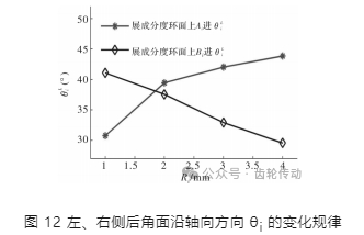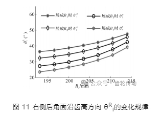 圖 11 是展成右側后角面時 θRi 隨環面半徑的變化趨勢,可以得出右側面入口刀齒 T4 處的齒根環面部位的夾角 θ4R 值最小。該處是在展成齒根的側刃帶時產生的,因此展成 T4 刀齒右側后角面時,展成齒根刃帶時最容易造成展成干涉。
