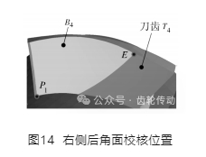 (2) 右側后角面入口第 2 個齒的齒頂處的 E 點,此點是展成齒根的側刃帶 P1 點時產生的,如圖 14 所示。