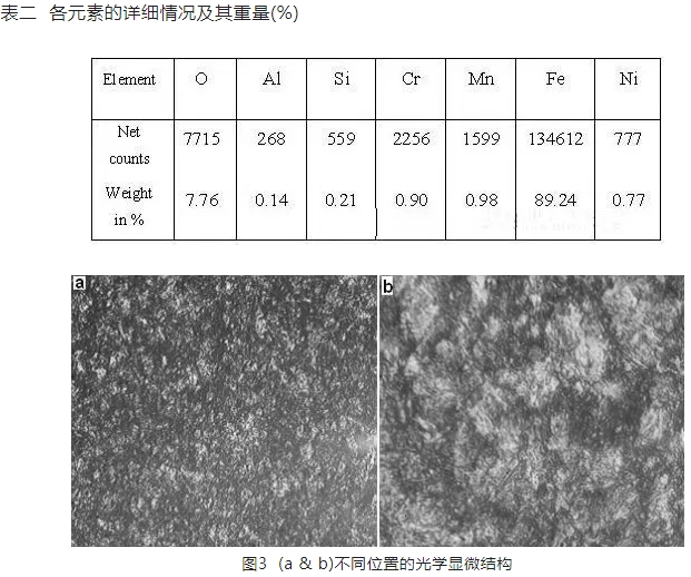 EDX顯示材料從行星齒輪齒轉移到根部。值得注意的是,行星齒輪是由鐵鉻鎳錳硅鋼[5].大部分鱗片富含鐵元素。EDX分析證明,氧化物形成在這個表面上。元素權重和計數的結果列于表二。