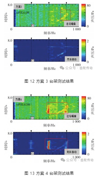針對以上優化改善對策進行組合裝配樣機,對不同方案總成分別進行臺架測試,測試驗證分析結果如圖 10 ~ 13.