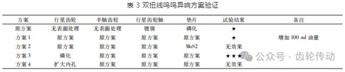 通過對整車、電驅動總成臺架測試以及差速器內部零件結構及工作原理分析,整車在雙扭線工況行駛時,行星齒輪與行星齒輪軸之間配合間隙較小,在差速器實現差速時,它們受載出現軸向和自轉運動,導致行星齒輪軸與行星齒輪內孔發生不連續的金屬摩擦聲; 另外行星齒輪內孔表面未采用涂層處理和行星齒輪軸表面采用鍍鎳處理,零件表面油膜吸附能力較低,形成地動態油膜較少,同時在 整車差速時,它們之間潤滑油膜穩定性的動態壓力遭到破壞,造成它們發生干摩擦,最終造成金屬摩擦聲,故通過上面異響產生的機理分析,制定以下驗證優化方案.