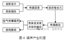 傳遞誤差是驅(qū)動(dòng)橋總成噪聲的激勵(lì)源,其引起的動(dòng)態(tài)嚙合力變化通過軸承等傳遞路徑傳遞到殼體;經(jīng)系統(tǒng)響應(yīng)后,產(chǎn)生振動(dòng)以及聲輻射噪聲。