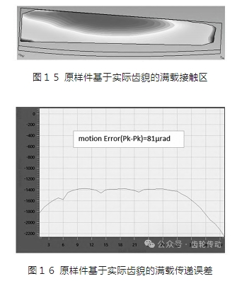 基于實(shí)際齒貌狀態(tài)的齒輪特性分析:基于實(shí)際測量的齒面誤差數(shù)據(jù),利用 GEMS軟件,將齒輪副的實(shí)際齒貌,反調(diào)為理論齒貌,形成基于實(shí)際齒貌的設(shè)計(jì)文件;以此為基礎(chǔ),利用 GEMS 軟件,進(jìn)行接觸分析,如圖14,仿真接觸區(qū)結(jié)果與齒輪副實(shí)際接觸區(qū)吻合很好。結(jié)合 MASTA 軟件的錯(cuò)位量信息,進(jìn)行加載接觸分析計(jì)算。