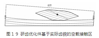 研齒優(yōu)化件在總成狀態(tài)下接觸區(qū)形態(tài)如圖23, 與齒輪副本身一致。