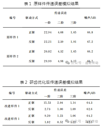 齒輪副噪聲和傳遞誤差檢測結(jié)果及對比:從檢測結(jié)果可以看出,優(yōu)化后齒輪副的噪聲和傳遞誤差均有明顯改善。