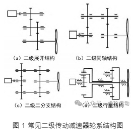 減速器傳動形式根據發動機功率、外形尺寸要求、傳動比的大小及發動機總體要求進行確定。二級齒輪傳動系統具有兩種形式,第一種為功率不分支的展開式,第二種為功率分支傳動。常見的發動機減速器的輪系結構如圖 1 所示。