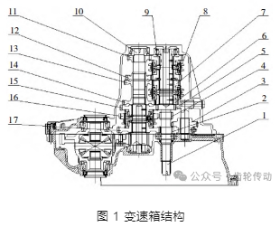 變速箱結(jié)構(gòu)如圖 1 所示,包括輸入軸、輸入軸一檔齒輪、惰輪、輸入軸倒擋齒輪、輸入軸二檔齒輪、輸入軸三檔齒輪、輸入軸四檔齒輪、輸入軸五檔齒輪、輸入軸六檔齒輪、輸出軸、輸出軸六檔齒輪、輸出軸五檔齒輪、輸出軸四檔齒輪、輸出軸三檔齒輪、輸出軸二檔齒輪、惰輪從動輪、輸出軸一檔齒輪,對應圖 1 的 1~17 編號所對應的零部件。