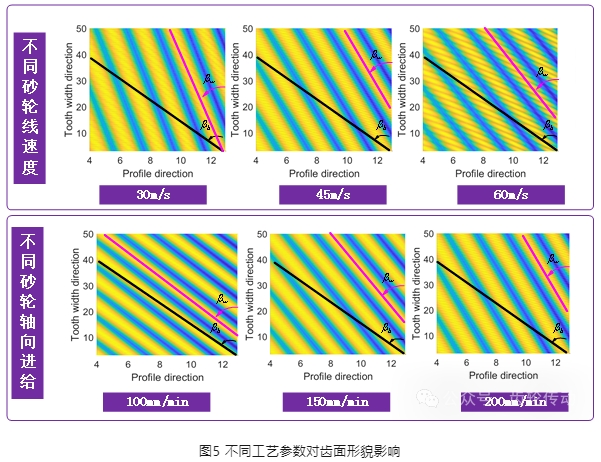 砂輪與齒輪展成切削過(guò)程包括兩個(gè)運(yùn)動(dòng),一個(gè)為旋轉(zhuǎn)運(yùn)動(dòng)一個(gè)為軸向移動(dòng),在切削運(yùn)動(dòng)過(guò)程中當(dāng)砂輪存在振動(dòng)時(shí)就會(huì)在齒面上形成波紋。為了研究砂輪振動(dòng)與砂輪線速度對(duì)齒面波紋影響,分別研究砂輪線速度30m/s、45m/s、60m/s時(shí)以及砂輪軸向進(jìn)給率為100mm/min、150mm/min、200mm/min時(shí)齒面形貌的變化規(guī)律,結(jié)果表明,隨著砂輪線速度增大波紋角增大,隨著砂輪軸向進(jìn)給率增大波紋角會(huì)減小,如圖5所示。