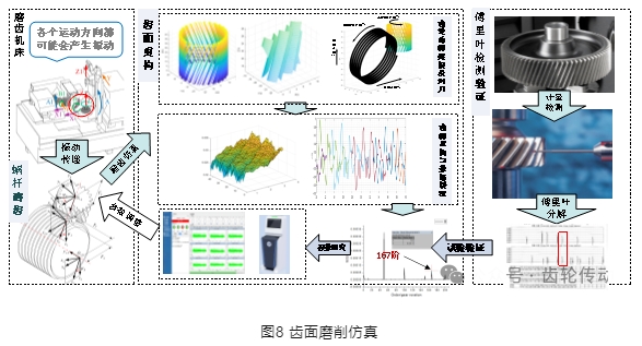 齒輪齒面存在的微觀規(guī)律波紋往往是引起鬼頻問(wèn)題的主要原因,這種微觀的規(guī)律波紋通常是由于磨齒加工過(guò)程中機(jī)床振動(dòng)引起的。搭建了齒輪磨削加工智能監(jiān)控系統(tǒng),突破了磨齒過(guò)程信息采集與磨齒創(chuàng)成仿真模型相結(jié)合的數(shù)字孿生技術(shù),提出了表面波紋的表征方法,實(shí)現(xiàn)了在磨齒過(guò)程中預(yù)測(cè)和管控鬼頻問(wèn)題,并通過(guò)單頻激振試驗(yàn)驗(yàn)證了磨削仿真的準(zhǔn)確性。