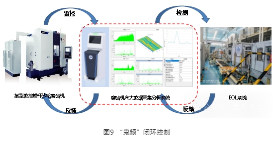 齒輪磨削加工智能監(jiān)控系統(tǒng)具備振動(dòng)等信號(hào)的數(shù)據(jù)采集功能,同時(shí)具備齒面虛擬仿真能力,在磨齒過(guò)程中對(duì)機(jī)床10階振動(dòng)制定攔截標(biāo)準(zhǔn)。總成EOL與齒輪磨削加工智能監(jiān)控系統(tǒng)相互配合,形成齒輪表面波紋閉環(huán)控制,如圖9所示。