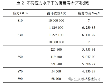 第一組試樣的疲勞壽命如表 2 所示。從表 2 可以看出,在不脫碳的情況下,試驗鋼僅在 810 MPa 應力水平下循環次數為 107 次,試樣未發生斷裂; 當應力水平超過 830 MPa 以上時,部分試樣開始出現斷裂; 當應力水平在 850 MPa 以上時,疲勞試樣全部斷裂。