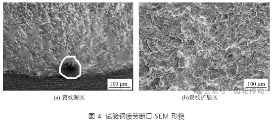 采用掃描電鏡對試樣疲勞斷口形貌進行觀察,如圖 4 所示。圖 4(a) 為試樣裂紋源區,圖中可以看出明顯的疲勞弧線,根據疲勞弧線找到疲勞源,可見,裂紋源為“魚眼狀”的非金屬夾雜物,夾雜物處易造成應力集中,產生疲勞裂紋; 圖 4(b) 為裂紋擴展區形貌,可見明顯的疲勞條紋,呈河流狀分布,屬于準解理斷裂,隨著裂紋不斷擴展,最終導致斷裂。