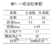 因減速器的一級(jí)齒輪轉(zhuǎn)速高,對(duì)修形設(shè)計(jì)敏感,容易出現(xiàn)嘯叫問(wèn)題,故作為本文的修形研究對(duì)象,齒輪參數(shù)如表1所示。仿真工況為整車(chē)滑行狀態(tài),強(qiáng)能量回收,轉(zhuǎn)矩為100 N·m。