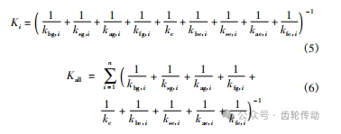 標準漸開線齒輪副在承載嚙合傳動過程中齒輪嚙合剛度主要包括 3 部分: 輪齒剛度(彎曲剛度 kb、剪切剛度 ks 與徑向壓縮剛度 ka ) 、齒輪接觸剛度 kc 與齒輪基體剛度 kf。單齒嚙合剛度 Ki 為上述各剛度的串聯形式,雙齒嚙合剛度 Kall為兩對輪齒嚙合剛度的并聯形式。