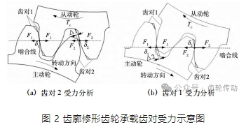 如圖 2a 所示,當主動輪順時針轉動時,齒對 1 首先進入嚙合承擔載荷,由于齒對 2 主動輪處存在修形齒廓,當齒對 1 沿嚙合線方向的變形量 δ1 大于齒對 2 處主動輪的齒廓修形量 Δ1 時,齒對 2 將進入嚙合并參與傳動,此時兩對輪齒共同承擔負載扭矩 Tc,并在嚙合線方向上的兩處作用點產生嚙合力 F1、F2,根據力矩平衡和廣義胡克定律可得: