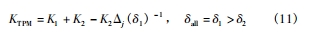 如圖 3b 所示,當齒對 1 以 a2 點即將進入接觸區域 A2 參與嚙合時,齒對 2 中主動輪待接觸區域存在修形齒廓,若齒對 1 沿嚙合線方向的變形量 δ1 大于齒對 2 中主動輪修形量 Δ1,則齒對 2 接觸參與嚙合,即為雙齒嚙合狀態,此時的修形齒輪嚙合剛度 KTPM可依據式 (17) 計算; 若齒對 1 沿嚙合線方向的變形量 δ1 小于齒對 2 中主動輪修形量 Δ1,則齒對 2 不參與嚙合,此時為單齒嚙合狀態(齒對 1 單獨承載) ,齒對 1 的嚙合剛度 K1 依據式(5) 進行計算。