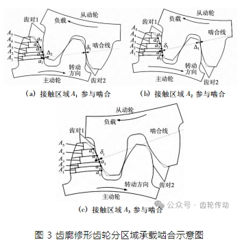 如圖 3a 所示,當齒對 1 以 a1 點即將進入接觸區域 A1 參與嚙合時,齒對 1 中從動輪待接觸區域存在修形齒廓,若齒對 2 沿嚙合線方向的變形量 δ2 大于齒對 1 中從動輪修形量 Δ2,則齒對 1 接觸參與嚙合,即為雙齒嚙合狀態,此時的修形齒輪嚙合剛度 KTPM可依據式 (12) 計算; 若齒對 2 沿嚙合線方向的變形量 δ2 小于齒對 1 中主動輪修形量 Δ2,則齒對 1 不參與嚙合,此時為單齒嚙合狀態(齒對 2 單獨承載) ,齒對 2 的嚙合剛度 K2 依據式(5) 進行計算。