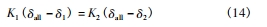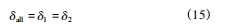 由于嚙合齒對在嚙合線方向上變形量 δ1、δ2 中的較大值與雙齒嚙合整體變形量 δall相等,此時無論δall = δ1≥δ2 或 δall = δ2≥δ1,根據式(14) 皆可推導出各嚙合齒對在嚙合線方向上的變形量 δ1、δ2 與雙齒整體嚙合變形量 δall相等,即: