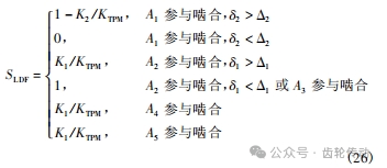 綜上所述,在一個嚙合周期內,根據齒對 1 在齒廓區域 A1、A2、A3、A4、A5 是否接觸參與嚙合及其嚙合狀態判定,計算參與嚙合齒對的嚙合剛度,根據式(18) ~ 式(25) ,可得到修形漸開線直齒輪齒間載荷分配系數 SLDF計算模型。