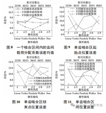 (3) 根據圖 5 ~ 圖 7 數據結果,分析齒廓修形后每個算例的單齒嚙合區位置誤差,以此可進一步評價解析算法的計算精度。其中,齒廓修形后的單齒嚙合區起始點位置誤差、結束點位置誤差與嚙合區間位置誤差分別如圖 9 ~ 圖 11 所示。不同修形高度、修形曲線 與配對齒數算例的單齒嚙合區起始誤差變化范圍分別為 5.8% ~12.4%、5.1% ~14.2%、5.8% ~10.1%,單齒嚙合區結束點位置誤差變化范圍分別 9.2% ~ 13.1%、 6.1% ~13.3%、9.7% ~ 12.6%,單齒嚙合區間位置誤差變化范圍分別為 3.2% ~12.5%、3.2% ~ 13.0%、2.2% ~ 8.8% ,表明解析算法所得出的單雙齒變換點及其區間大小與有限元結果之間誤差較小,可較為準確地計算出單雙齒嚙合變換點以及嚙合區間位置。因此,本文解析算法中依據修形量與變形建立的單雙齒嚙合區間判定方法具有較高的計算精度,可較為準確的計算單雙齒變換點以及嚙合區間位置。