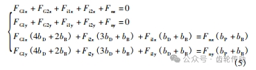 ②曲軸受力分析。由圖 4b 所示,通過擺線輪受力分析與力矩平衡方程可知作用力 Fi1、Fi2和 Fn 已知,只有曲軸兩端的 FG1、FG2未知,通過水平面與垂直面的力與力矩的平衡方程可得式(5) 。