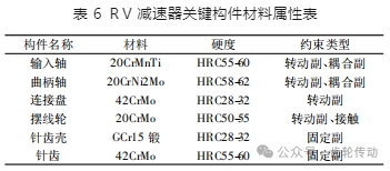 將 RV 減速器裝配體模型以 X_T 格式導(dǎo)入 AD-AMS 中,并給各關(guān)鍵零部件定義材料屬性,RV 減速器的材料屬性如表 6 所示。