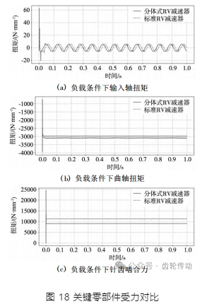 通過虛擬樣機仿真,獲得 RV 減速器在太陽輪輸入轉(zhuǎn)速 2400 rpm 下,輸出軸負(fù)載 425 N·m 的工況下輸出端角速度曲線,如圖 18 所示。從圖 18a 中可以看出,在相同工況下,減速器效率相同,由圖18b 和圖18c 可知,優(yōu)化后減速器的曲柄軸與針齒等關(guān)鍵零部件受力更小,機構(gòu)可靠性更高。