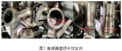 通過統計分析數百件失效的十字軸及行星齒輪,軸間差速器十字軸數量與輪間差速器十字軸(或一字軸)數量相當,即軸間差速器十字軸故障率是輪間差速器的2倍。重點針對軸間差速器進行研究,解決辦法同樣適用輪間差速器。故障模式如圖1所示。