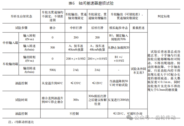 3)在中橋做效率臺架試驗時發現,由于阻力的作用中橋輸入轉速與貫通軸轉速始終存在微小差異,說明軸間差速器始終處于工作狀態。在實車運行過程中,即便平直道路行駛可能軸差、輪差也始終處于微動磨損運動中,尤其某個輪胎出現磨損不均勻滾動半徑不一致時或顛簸路況時。這種常規磨損工況當前標準已經能夠充分驗證。