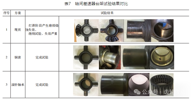 按改進的試驗方法,現生產產品市場故障得以充分復現,銅套及滾針軸承方案滿足臺架試驗標準,詳見表7。
