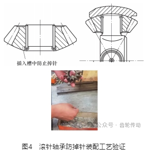 在現有產品上改進兩種方案均,需要減小十字軸直徑或加大行星齒輪內孔直徑。通過有限元計算臨時按十字軸直徑減小2.5mm來進行試制樣件,為便于快速測試效果,采用了市場現有的帶保持架的滾針軸承(見圖3)。