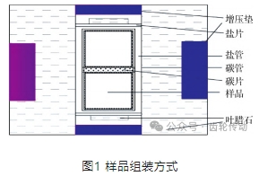 實驗為提高合成壓力,對組裝結構進行了改進,在充分考慮高壓合成安全性和穩定性的條件下,在原有組裝結構6個面添加增壓塊,并通過調整錘壓的方式提高了合成塊的燒結壓力。實驗時采用間接加熱方式,依靠腔體內部的石墨發熱體加熱 CBN 粉末,并在腔體內采用氧化鋯保溫材料,以加強高壓燒結系統的安全性和腔體燒結溫度的均勻性。實驗過程中,利用Bi、Ba、Ti金屬絲的高壓相變 點標定腔體內部的實際壓力。高壓腔體壓力分4個梯度,分別為 5.5、6、6.5、7 GPa,不同的實驗條件下只調整最高壓力值,升壓段和降壓段保持一致;保溫時間為 700 s,溫度為 1 500 ℃。圖 1 為樣品組裝方式。燒結塊是由增壓墊、樣品、鹽管、碳片、碳管和葉臘石塊等一起組成的實心塊體。葉臘石是層狀結構,在高壓下有良好的傳壓效果。鹽管的作用是為了使高溫下熔融鹽起到均衡壓力的作用,使原料粉體盡量接近等靜壓的狀態。增壓墊的作用是為了進一步提升內部壓力。同時利用碳片、碳管等的導電性能對組裝塊進行加熱燒結,最終合成出 PCBN材料。