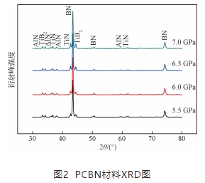 反應過程中合成的 TiN,AlN 和 TiB2具有非常優良的力學性能,如高硬度、耐磨損性、高導熱率和較低的熱膨脹系數等,其與 CBN 的匹配度也很好,非常適合作為PCBN的結合劑。綜上所述實驗合成的 PCBN 材料兼具韌性好,熱穩定性高,硬度高,導電性好等優勢,具有良好的綜合性能。由XRD圖可知,不同合成壓力下 PCBN 材料的物相無明顯差別,表明當壓力達到 5.5 GPa 時,就能合成 PCBN 材料。隨著合成壓力的提升,位于42.7°左右的TiN和 44.4°左右的TiB2的衍射峰強度均有不同程度升高,表明提高合成壓力可以起到增強復合材料結晶度的作用,有利于材料力學性能的提升。