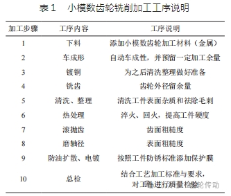 在銑齒機上,小模數(shù)齒輪用輪廓與齒輪齒槽形狀完全一致的齒輪銑刀沿工件軸向進給。每銑一個齒槽,工件進行一次分度,即轉(zhuǎn)過一個齒,依次銑削出全部齒槽。不論是漸開線齒輪還是修正擺線齒輪,原理相同。對于不同的銑削加工工序有不同的工藝要求,如表 1 所示。