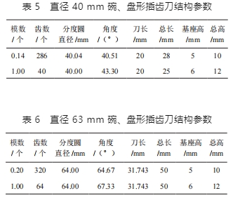 小模數(shù)齒輪插齒加工是利用插齒刀具與工件齒輪之間的嚙合運動,使刀具形成往復的運動狀態(tài),并且圍繞自身軸線進行運動,進而在運動中切削出工件的齒形。插齒運動還包含圓周、徑向、分度、讓刀 4 種,因此小模數(shù)齒輪插齒可以加工部分具有較高要求的齒輪,如雙聯(lián)齒輪、內(nèi)齒輪等。此外,小模數(shù)齒輪插齒加工對于刀具的精度要求較高。例如,公稱分度圓直徑為 40 mm 和 63 mm 兩種碗、盤形插齒刀結構參數(shù),如表 5 和表 6 所示。