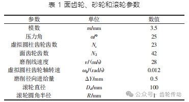 不同的砂輪修整工藝參數會導致砂輪形狀和特性的不同,進而導致面齒輪齒面精度和粗糙度的不同。影響砂輪磨削性能的主要修整工藝參數有:滾輪與砂輪在相切點的線速度比 q、滾輪進給速度 f(μm/r)、單次修整切深 ap(mm)。采用控制變量法對三個主要修整參數進行研究,通過試驗分析其對面齒輪齒面粗糙度 Ra 的影響。試驗使用的面齒輪、砂輪和滾輪的相關參數,如表 1 所示。砂輪粒度 120#,磨粒材料為綠碳化硅,結合劑材料為樹脂,硬度為 L。面齒輪磨削毛坯的材料采用 45 鋼,并經過高頻淬火熱處理。