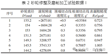 試驗數據,如表 2 所示。其中滾輪進給速度 f 均為0.769μm/r, 單次修整切深 ap 均為 0.02mm。