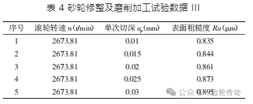 單次修整切深 ap 定義為:單次修整走刀后砂輪漸開線上各點沿該點法向的去除量。由于砂輪為漸開線形式,因此 ap 在砂輪輪廓上都不同。試驗數據,如表 4 所示。其中,砂輪頂端的切點線速度比 q 均為 0.5,滾輪進給速度 f 均為 0.769μm/r。