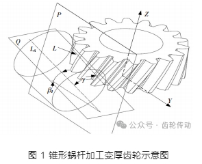 圖 1 是錐形蝸桿加工變厚齒輪的示意圖。為簡單起見,用錐臺示意錐形蝸桿。圖中:平面 Q 為過錐形蝸桿軸線的平面;平面 P 為產(chǎn)型齒條的中性面;直線 L 為平面 P、Q 的交線;γ 是錐形蝸桿的錐角;βI 是錐形蝸桿的安裝角。根據(jù)文獻 1,為實現(xiàn)無干涉的連續(xù)展成磨削變厚齒輪,以上幾何元素需滿足以下條件:①錐形蝸桿軸線與面 YOZ 平行;②平面 P 與平面 Q 垂直。