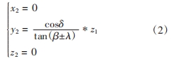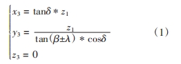 為方便計算,建立了如圖 2 所示的坐標系。圖中:δ 是變厚齒輪的軸向后角,P1 是平面 Q 與產(chǎn)型齒條中性面交線與軸 Z 的交點,P2 是平面 Q 與面 YOZ 的交線和軸 Y 的交點,P3 是平面 Q 與產(chǎn)型齒條中性面交線與面 XOY 的交點。令點的 X、Y、Z 軸的坐標分量為 x1、y1、z1,根據(jù)前述的幾何條件,可得點 P3 的坐標分量 x3、y3、z3。