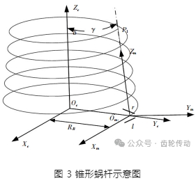 錐形蝸桿的左右齒面可以看成是由蝸桿左右軸截面廓形沿錐形螺旋線掃略生成。圖 3 是錐形蝸桿齒面示意圖。圖中:坐標系 Sc 為參考坐標系,坐標系Sm 為可動坐標系;錐形蝸桿左右齒面軸截面廓線與坐標系 Sm 固連;在錐形蝸桿的大端,坐標系 Sc 與 Sm 原點的距離為 RB(錐形蝸桿大端分度圓半徑)。