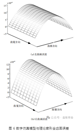 圖 5 是錐形蝸桿磨削變厚齒輪數(shù)字仿真得到的變厚齒輪左右齒面。將由數(shù)字模型算得的齒面與理論變厚齒輪的齒廓對比,得到數(shù)字模型與理論齒廓間的全齒面誤差(如圖 5 所示)。