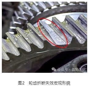1擋齒輪在表1所示工況進行測試,進行至30% 試驗進度時,發(fā)現(xiàn)試驗失效。失效模式為輪齒折斷,實物形貌見圖 1。輪齒折斷定義為嚴重的齒輪失效故障,影響車輛安全。