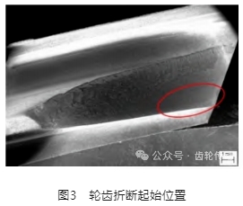 對失效齒輪進行宏觀觀察,發(fā)現(xiàn)其中一個輪齒折斷的起始位置為齒根未嚙合區(qū)域(圖2)。本批次齒輪已經(jīng)在滲碳淬火后對齒輪根部進行了噴丸處理,可以在一定程度上增強齒根彎曲強度,原始設(shè)計計算結(jié)果說明齒根彎曲強度安全系數(shù)已經(jīng)足夠,可以保證表1中工況安全進行。同時調(diào)查其它批次產(chǎn)品使用情況,均未發(fā)現(xiàn)異常情況。