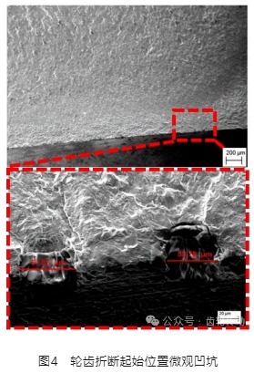 (1)齒輪輪齒折斷由齒根非嚙合區(qū)域起源,起源位置有凹坑,該凹坑造成了齒輪運轉(zhuǎn)時應(yīng)力集中,發(fā)生破壞。