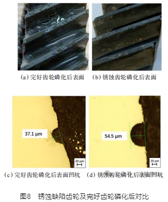(3)引起失效的凹坑為齒輪熱后加工發(fā)送至磷化供應(yīng)商處時,在流轉(zhuǎn)過程中齒輪銹蝕導致。該銹蝕凹坑同正常磷化凹坑形貌及尺寸均不同。