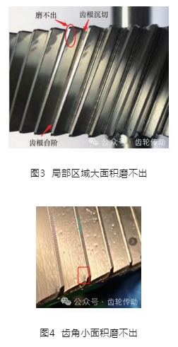 由圖 2 可知,靠近根圓的端面平面度為 0.02mm,軸向圓跳動(dòng)為0.19mm,偏擺儀檢測(cè)的軸向圓跳動(dòng)為0.22mm,說明工件端面與硬車的內(nèi)孔傾斜較大,即工件熱處理后端面產(chǎn)生了扭曲變形。磨不出的狀態(tài)分圓周局部區(qū)域大面積磨不出和齒角小面積磨不出兩種,如圖3、圖4所示。