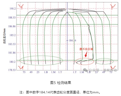 無論是局部區(qū)域大面積磨不出還是齒角小面積磨不出,均說明齒端面扭曲,造成局部加工余量不足。對(duì)于大面積磨不出齒輪,表現(xiàn)為齒的一端磨不出,存在齒根沉切現(xiàn)象,另一端出現(xiàn)齒根臺(tái)階(見圖3)。檢測(cè)結(jié)果如圖5所示。