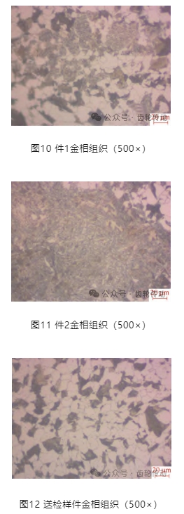 (2)原材料及毛坯 齒輪材質(zhì)采用國內(nèi)某鋼廠生產(chǎn)的SCM420H鋼,且一直沒有變化,毛坯鍛造廠家也沒有更換。為查明原因,首先檢查毛坯正火質(zhì)量,從生產(chǎn)線上取2件滾齒調(diào)試毛坯,檢測(cè)金相組織,如圖10、圖11所示。毛坯金相組織要求晶粒度≥5級(jí),貝氏體(根據(jù)用戶提供的金相照片,在200×下檢測(cè))<10%,硬度160~190HBW。實(shí)際檢測(cè),件1硬度為183~186HBW,件2硬度為187 ~191HBW,存在大量貝氏體組織,金相嚴(yán)重不合格。于是又對(duì)來料送檢樣件進(jìn)行金相組織檢測(cè),結(jié)果如圖12所示。檢測(cè)結(jié)果顯示,金相組織合格,硬度為175~176HBW。由此可看出,整個(gè)批次工件正火不均勻,說明工件變形不合格與正火金相組織不合格有很大關(guān)系。